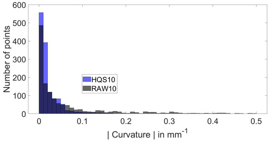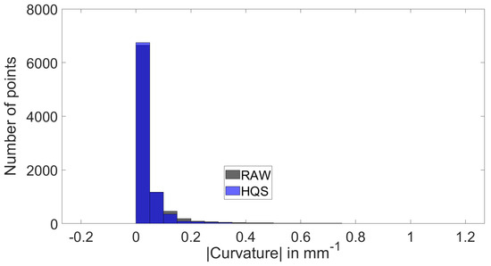 At this stage of the work, our fitting method splits each discrete isotherm (composed with a maximum of about 2500 points) into a maximum of about 25 connected patches. Figure 8 shows the result of a fit along an isothermal curve. Note that the beginning of the isotherm is chosen in a low-curvature zone. So, the initial curvature of the first patch is arbitrarily fixed at 0.1 [mm−1] to respect the curvature orientation. As a reminder, the first patch and the last one of each isoHQ are only connected.