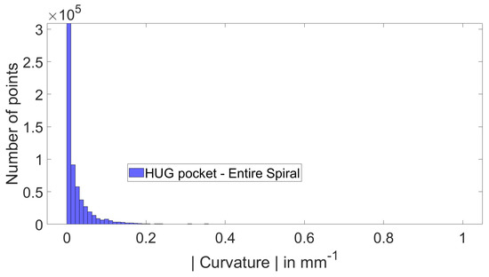 To analyze the entire trajectory, histograms of the toolpath absolute curvature value ( in mm−1) are used as well as and quantiles of named Cut95 and Cut99. These last indicators can quickly give, unlike VPOp, the geometrical quality of a toolpath and, consequently, the possibility of NC to respect the programmed feed rate.