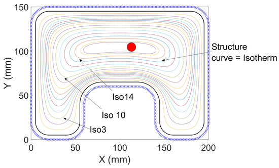 Given their smooth nature [31], the solutions of a thermal problem (i.e., isotherms) are chosen for building structure curves: a layer of the pocket is uniformly heated while the border is maintained at . The heat equation is (Equation (2)):