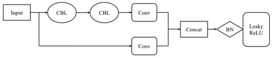 The Backbone part adopts the New CSP-Darknet53 [] model and utilizes the Focus module (Figure 2) to perform slicing operations, transforming the 640 × 640 × 3 image into a 320 × 320 × 12 tensor. The structure of CSP1_X is shown in Figure 3, where X represents the number of residual modules (Res units) in the structure. The CBL module consists of a convolutional layer, a batch normalization layer (BN), and an activation function (Hard-Swish activation function []). Each Res unit consists of a series of convolutional layers and a residual connection. The two convolutional layers (Conv) are used to adjust the number of channels in order to add the two calculations together (Concat).