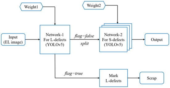 To enhance the detection proficiency for small-sized targets, a detection model comprising two cascaded YOLOv5 detection modules is proposed. These two modules are specifically tailored to identify two categories of defects: L-type defects and S-type defects. By harnessing the synergy between upstream and downstream processes, precise detection of all defect types is achieved, as demonstrated in Figure 7. This cascaded approach ensures comprehensive defect detection by segmenting the task into specialized modules, each adept at handling specific defect types, thereby enhancing the overall accuracy and efficiency of the detection system.