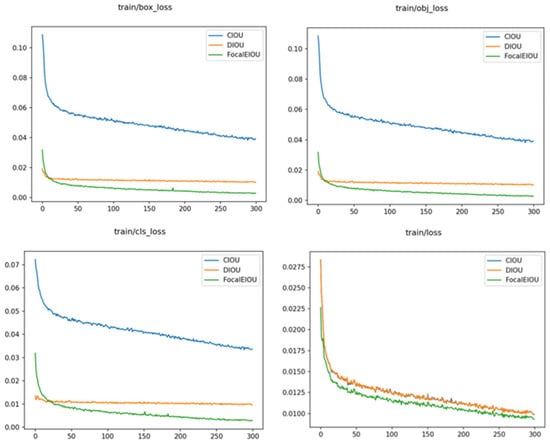 The decrease of box_loss means that the model can accurately predict the location of the target; the decrease of obj_loss means that the model can correctly identify the target in the image; the decrease of cls_loss means that the model has higher accuracy in different categories. As shown in Figure 9, after adding focal_eiou_loss to the loss function, lower box_loss, box_loss, and cls_loss were obtained, thus obtaining lower loss in total, which proved that the proposed Focal-EIoU achieves significant performance advantages in terms of convergence speed and final convergence results.