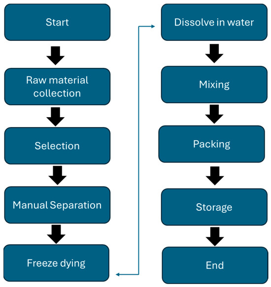 Carao fruit was collected in Catacamas Municipality, Olancho Department, Honduras. Once the carao was received, a selection process was carried out to ensure food safety and allow for the preparation of plant material and carao flour (Figure 1). Carao fruit was manually peeled, and the pulp was separated. Later, the pulp was mixed with water (10% wt./wt.) and stored frozen (−80 °C) until it was lyophilized (LIOTOP model L 101). The obtained solution was lyophilized at −73 to −76 °C and 0.1–0.3 Pa for 48 h. The flour was packaged in low-density polyethylene bags with a capacity of 5 lb. Lyophilized carao flour obtained a particle size range between 150 μm and 450 μm.