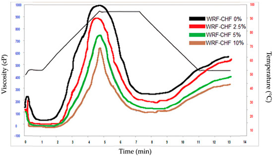 Viscosity profiles of rice flours determined by RVA. The 0%, 2.5%, 5%, and 10% C-CHF treatments correspond to the CHF addition of 0%, 2.5%, 5%, and 10%, respectively.
