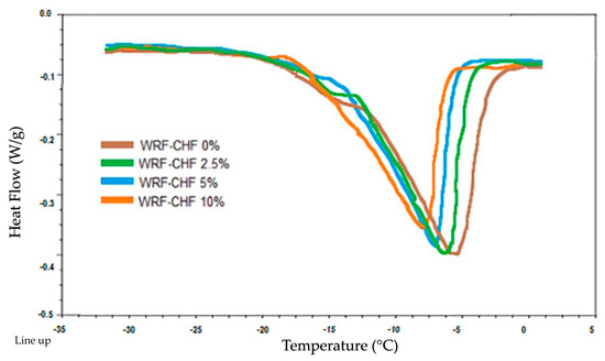 Heat flux of rice flours determined by DSC. The 0%, 2.5%, 5%, and 10% C-CHF treatments correspond to the CHF addition of 0%, 2.5%, 5%, and 10%, respectively.