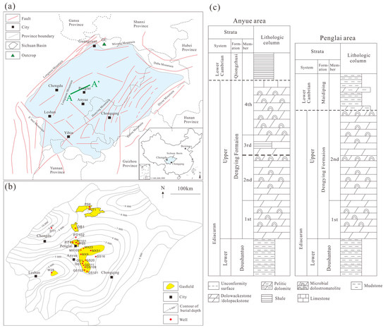 The study area is located in the SW China Sichuan Basin (Figure 1a), where paleo-uplift structures formed during the Caledonian period were developed (Figure 1b). Subsequently, after undergoing multiple stages of tectonic activities, the paleo-uplift underwent overall inheritance and development and ultimately formed after the Himalayan Movement [29,30]. According to microbial content and sedimentary structure, the Ediacaran Dengying dolomite formation can be divided into four members [9]. Among them, the 2nd and 4th Members comprise microbial dolostromatolite, dololaminite, and dolograinstone [2], the 1st Member is mainly dolowackestone, and the 3rd Member comprises shale dolowackestone and pelitic dolomite. Due to the uplift movement during the Tongwan period of the Late Ediacaran, the upper part of the 2nd and 4th Member underwent erosion and extensive karstification, forming an unconformity surface (Figure 1c). Unlike the Anyue area, most of the Penglai area lacks the 3rd Member and 4th Member, and the 2nd Member is directly in unconformable contact with the overlying Cambrian strata.