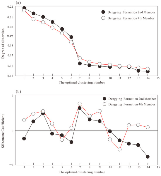Using the unsupervised intelligent method of FCM-DSDFP, cluster the principal component information parameters obtained from Dengying Formation 4th Member and Dengying Formation 2nd Member separately, with an iteration count of 10. Scientifically analyze the number of clusters and the clustering effect using the principle of clustering feature analysis. Among them, the distortion degree of Dengying Formation 4th Member and Dengying Formation 2nd Member shows a significant mutation at position 7, and the silhouette coefficients at position 7 are 0.84 and 0.77, respectively, which are closest to 1 (Figure 2a,b). Based on the two indicator coefficients, it is suggested that the Dengying Formation 4th Member and Dengying Formation 2nd Member are most suitable to be divided into seven categories, and the clustering effect is the best.