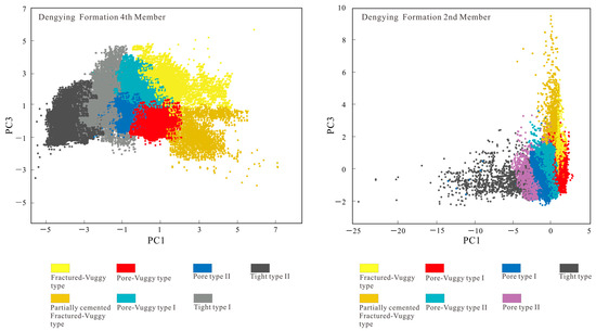As shown in the cross-plot of PC1 and PC3 (Figure 3), the larger the PC1 in the Dengying Formation 4th Member, the lower the RT and RXO, the larger the PC3, the smaller the DEN, and the higher the AC, indicating a reservoir facies with well-developed reservoir space in the upper right corner and a relatively dense reservoir facies in the lower left corner. The larger the PC1 in the Dengying Formation 2nd Member, the lower the RT and RXO, the larger the PC3, and the higher the AC. The upper right corner indicates the reservoir facies with well-developed reservoir space, while the lower left corner indicates the relatively dense reservoir facies. In addition, each type of data has fuzzy transition areas, indicating a transition phenomenon between each type of reservoir facies and reservoir facies with little difference in characteristics, which is consistent with the observation results of the rock core.