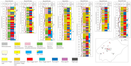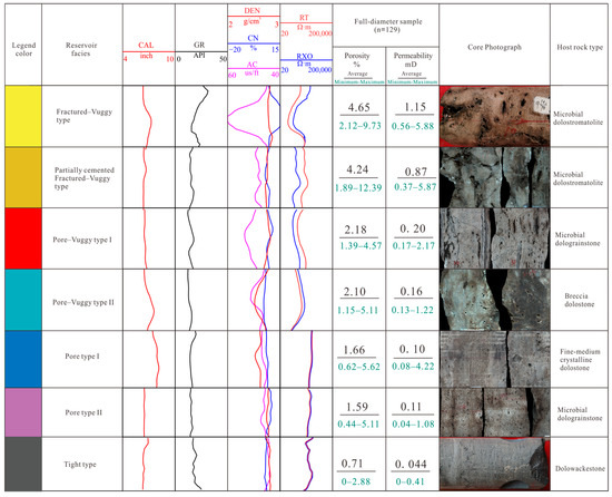 Pore-Vuggy type samples are light and brownish-gray, with microbial dolograinstone as the predominant lithology. Porosity in the cores varies from 1.42% to 4.51%, with an average of 2.92%; permeability ranges from 0.17 mD to 4.87 mD, averaging 0.32 mD. The Pore-Vuggy type is characterized by conventional logging responses, including slightly enlarged caliper, medium to high resistivity, inconsistent invasion characteristics, and a wide range of densities (Figure 4).