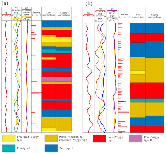 Two methods were applied to verify the reservoir facies identification results based on intelligent algorithms proposed in this study. The first method is to compare the identification results with the reservoir facies types identified by core observations (Well PT103 and PS13). As shown in Figure 6, the reservoir facies types divided by this method are highly consistent with the core observation results, and the boundary division of the types is accurate. As shown in Figure 6a,b, the boundary positions of the Fractured-Vuggy type or partially cemented Fractured-Vuggy type correspond well with the boundary positions divided by the intelligent algorithm.