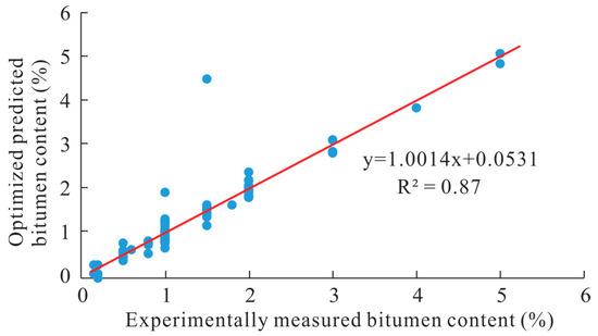 The correlation between the optimized predicted bitumen content and the experimentally measured bitumen content for the Dengying Formation 2nd Member in the study area.