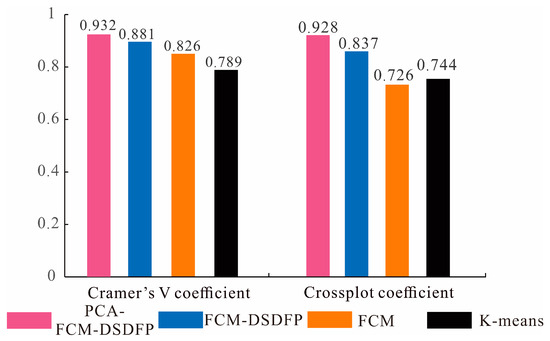 To assess the proposed algorithm’s applicability and the input data’s reliability, control experiments are carried out using four unsupervised learning algorithms (Figure 11): PCA-FCM-DSDFP, FCM-DSDFP, FCM, and K-means. The Cramer’s V and Crossplot coefficients served as standards for testing algorithm accuracy. Results showed that for denoised input data using the PCA algorithm, the Klem and convergence coefficients were 0.932 and 0.881, respectively, while for non-denoised data, they were 0.928 and 0.837. Non-denoised input data somewhat interfered with algorithm accuracy. In control experiments with FCM-DSDFP, FCM, and K-means algorithms, FCM-DSDFP accuracy was higher than FCM and K-means. This indirectly confirmed that PCA-FCM-DSDFP is more applicable than FCM and K-means, and it can be applied to similar reservoirs to further verify its suitability. It is noteworthy that for reservoirs with few categories, unsupervised learning algorithms are suitable. However, for reservoirs with complex categories, unsupervised learning classification remains challenging.