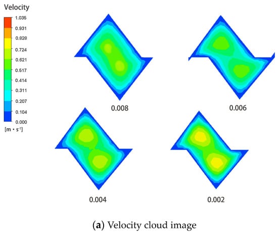 Based on the presented color distribution in Figure 15, a comparative analysis between Figure 15a,b reveals that except for the mainstream of the flow passage with a taper of 0.0080, the rest of the flow passage is dumbbell-shaped or rectangular. This indicates that the flow passage with a taper of 0.0080 has a wider water exchange space than the flow passage with other tapers. Therefore, a cross section with a taper of 0.0080 has a greater advantage. In the flow velocity vector diagram of the 1–0 section, the section with the taper of 0.0080 and 0.0060, the velocity vector is basically perpendicular to the section when it is near the wall, so there will be no phenomenon of rotating movement of the fluid near the wall. On the contrary, the velocity vector of the section with a taper of 0.0040 to 0.0020 near the wall still has a part parallel to the section. Therefore, the section with a taper of 0.0080 and 0.0060 is more conducive to sediment deposition on the velocity vector diagram of the buffer slot section.