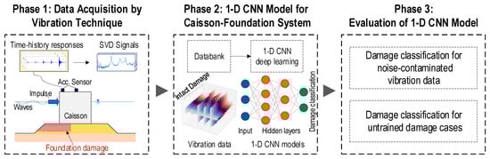Figure 1 illustrates the CNN deep learning model scheme for caisson-foundation system using vibration data. This scheme comprises three phases: (1) data acquisition via the vibration technique, (2) construction of the 1-D CNN model for the caisson-foundation system, and (3) evaluation of the 1-D CNN model. In Phase 1, the databanks corresponding to foundation damage on the caisson system are generated for deep learning models. The foundation damage simulation involves removing a certain amount of sand and gravel from the existing foundation. The vibration data (i.e., time-history and SVD responses) are acquired by accelerometers under man-made excitation. The time-history responses obtained from several accelerometers are concatenated to form one continuous response. The SVD responses are derived from the time-history responses using the frequency domain decomposition (FDD) method. The vibration data are processed with data augmentation to form a databank and used for the CNN model in the subsequent phases.