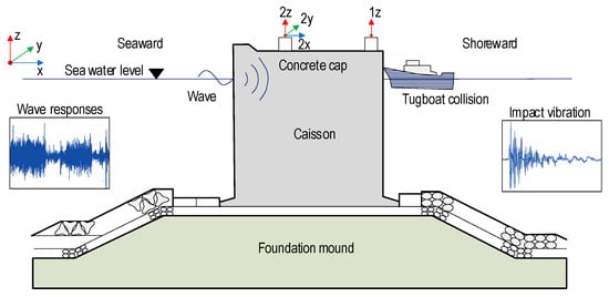 Many researchers have utilized vibration-based techniques to handle the transient interactions between waves, structures, and foundations [3,8]. For caisson-foundation structures, vital structural information can be obtained from a few sensors strategically placed in the small above-water section [5,6,7]. Ming et al. [17] studied the dynamic response of a caisson breakwater using a rigid body on an elastic foundation model under wave action. Lee et al. [8] employed vibration-based methods to detect damage at the interface between the caisson and the foundation. Huynh et al. [9,10] combined simplified analytical approaches with in situ vibration measurements to assess caisson-foundation system integrity. Lee et al. [11,12] developed a practical scheme to differentiate the impact of foundation conditions and environmental factors on the vibration characteristics of the breakwater system. Pham et al. [13] proposed the pseudo-wave method superposing the vibration responses from several man-made excitations to simulate the wave impact on the caisson system.
