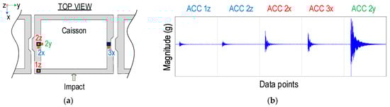 Vibration measurements for a caisson-foundation system: (a) accelerometer setup and impact load; (b) Concatenated time-history response.