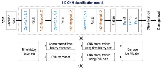 Recent studies have demonstrated the effectiveness of 1-D convolutional neural networks (CNNs) in real-time applications and the ability to learn complex tasks. Such 1-D CNN models can be trained using vibration features such as singular value decomposition (SVD) and time-history responses. SVD data are obtained from multiple preprocessing steps for each damage level [13]. As an alternative approach, time-history responses from accelerometers can be directly utilized for the CNN model, bypassing several preprocessing steps, thereby enhancing speed and reducing computational costs [14,15,16].