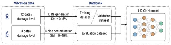 Figure 5 illustrates the process for configuring the noise-contaminated databank. The vibration data were obtained in 15 ensembles for each foundation damage level. Eighty percent (80%) of the total vibration data was used for training and validation datasets. Data generation used Gaussian noise with standard deviations of 0%, 1%, 2%, 3%, 4%, and 5% of the signal amplitude. The remaining 20% of the total vibration data had noise levels injected ranging from 1% to 16% (in 1% increments) to form the evaluation dataset. This evaluation dataset was used to examine the effect of noise on the accuracy of the 1-D CNN model.