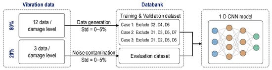 As shown in Figure 6, noise levels ranging from 1% to 5% were added to the 12 ensembles to create the training and validation datasets. Three untrained cases were designed to examine the effect of missing data on the performance of the 1-D CNN. In Case 1, the training and validation set excluded three damage levels: D2, D4, and D6 (from eight damage levels D0–D7), while in Case 2 and Case 3, the training and validation set excluded four damage levels (Case 2: D1, D3, D5, and D7; Case 3: D1, D2, D5, and D6). For the evaluation dataset, the remaining three ensembles were injected with noise levels from 1% to 5% with intervals of 1%.