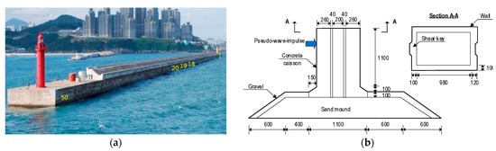 Figure 7a shows an Oryuk-do caisson-foundation system investigated by Lee et al. [12]. The submerged breakwater system consists of 50 caisson units and has a total length of 1004 m. Each caisson unit is 20 m in width, 20 m in length, and 20.78 m in height. As detailed in Figure 7b, the concrete caisson in the lab-scale experiment was scaled down to 1/20 of the real size, with measurements of 1200 mm in width, 1100 mm in length, and 1300 mm in height. The foundation mound of the lab-scale system is made of a sand layer of 480 mm and an armor gravel layer of 100 mm.