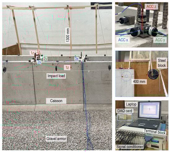 The data acquisition system comprised a signal conditioner (model 481A, PCB Piezotronics, New York, United States), a terminal block (BNC 2090A), a DAQ card (model 6036E), and a laptop. A steel block suspended from a 1300 mm rope was swung freely from a distance of 400 mm to simulate the impact load on the caisson. The time-history responses were collected in 15 ensembles. The obtained time-history responses were then concatenated according to the previously described methodology.