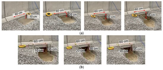 As shown in Figure 9a, the cut-off width was set to 60 cm (i.e., half of the caisson width). Damage 1 to Damage 4 were introduced by removing the depth of the mound up to 10 cm, 20 cm, 30 cm, and 35 cm, respectively. Damage 1 removed 0.37 kN of gravel, which was approximately 2.3% of the armor gravel. Damage 2 removed a total of 0.90 kN material from foundation. It involved 0.46 kN of gravel (about 2.8% of the armor gravel) and 0.44 kN of sand (about 0.7% of the sand mound). Damage 3 resulted in the removal of 0.56 kN gravel (about 3.4% of the armor gravel) and 0.91 kN sand (about 1.5% of the sand mound). Damage 4 removed another 50 mm layer, bringing the total to 0.58 kN of gravel (about 3.6% of the armor gravel) and 1.14 kN of sand (about 1.9% of the sand mound).