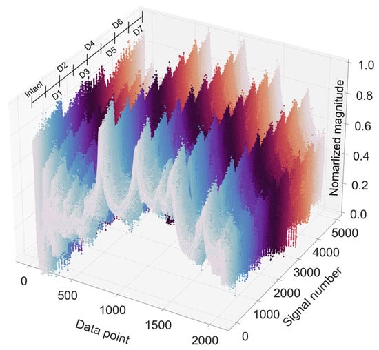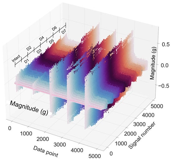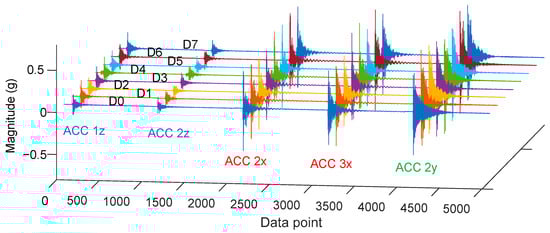 The time-history responses were acquired at a sampling rate of 1.0 kHz. For each impact load, the time-history responses of five sensors (i.e., ACC1z, ACC 2z, ACC 2x, ACC 3x, and ACC 2y) were recorded simultaneously. The observation period was set to 1 s, resulting in 1000 data points per response (90 data points before and 910 data points after the impact load). Comparing the five accelerometers on each caisson, the acceleration magnitude in the z-direction was smaller than in the x- and y-directions. The time-history responses from the five sensors were then concatenated into a single response of 5000 data points. The representative time-history responses of five accelerometer sensors in eight foundation damage levels (D0–D7) are plotted in Figure 10.