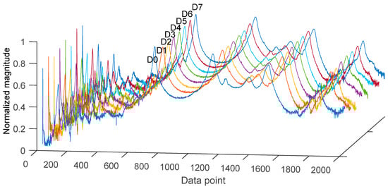 The FFD method was used to extract the SVD from the time-history responses. Figure 11 plots the SVD responses calculated simultaneously from all five accelerometers (i.e., 1z, 2z, 2x, 3x, and 2y). The SVD responses were relatively uniform under all foundation damage levels (D0–D7). Three peaks were identified to represent the caisson’s behavior: the first peak frequencies ranged from 25.9 to 27.3 Hz, the second from 183.6 to 186.8 Hz, and the third from 279.8 to 281.2 Hz.