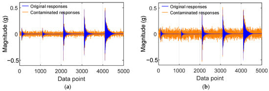 Illustration of noise contamination to time-history responses: (a) 5% noise; (b) 10% noise.