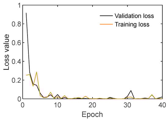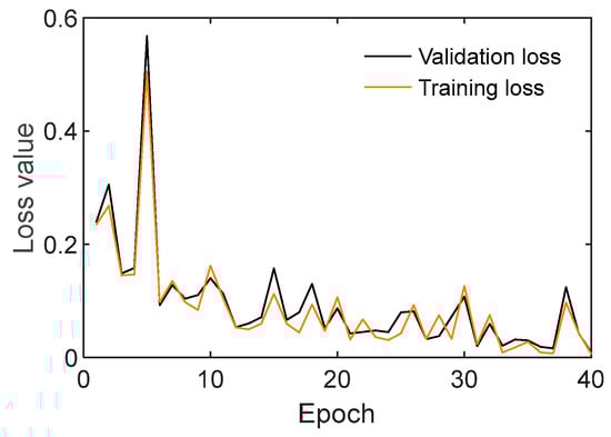 Figure 14 shows the loss values of the CNN model trained by time-history responses. Training loss decreased in the first five iterations and then converged until the end of training. Validation losses sharply decreased in the initial five iterations and maintained stable status until the end at 40th iteration. In general, the training and validation losses performed well and converged after only a few epochs.