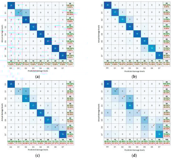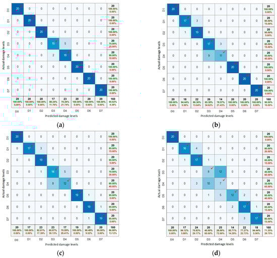 Figure 25 shows the damage classification results of the CNN model with partially untrained SVD databanks. For Case 1 (Figure 25a), all results for trained levels showed no misclassification. The damage levels D2, D4, and D6 were classified to nearby levels D1, D3, and D7, respectively. Case 2 (Figure 25b) demonstrated no misclassification in the results for trained levels (i.e., D0, D2, D4, and D6). The untrained damage levels D1, D3, and D7 were classified into nearby levels D2, D4, and D6, respectively. The untrained damage level D5 was classified into D4 and D6.