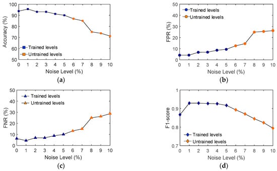For trained noise levels (0–5%), FPR values ranged from 4% to 11% and increased significantly to 20% at a noise level of 6% and continued to rise to 41% at a noise level of 10%. Similarly, FNR values remained below 12.5% for noise levels 0–5%, but increased significantly to a maximum of 47% at noise level 10%.