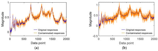 The concatenated time-history responses were processed with controlled noise contamination to improve the CNN model’s adaptability to real-world conditions. Noise was introduced at 1–10% standard deviation levels across ten iterations. Figure 12 illustrates examples of contaminated responses compared to their original responses.