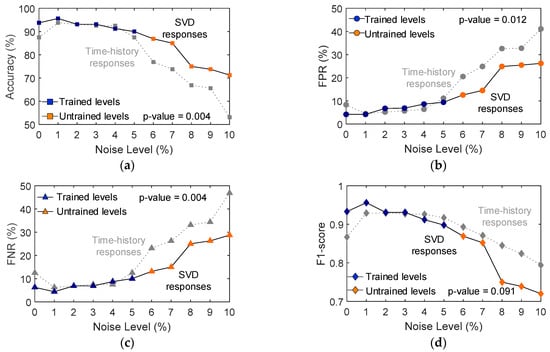 In Figure 21d, the F1-score of the CNN model trained using SVD responses was above 0.9 for trained noise levels 0–5%. The F1-score rapidly declined for the untrained noise levels and dropped to 0.72 at a noise level of 10%. The F1-score indicated that the performance is not as strong as the CNN model trained using time-history responses.
