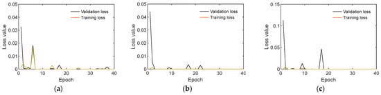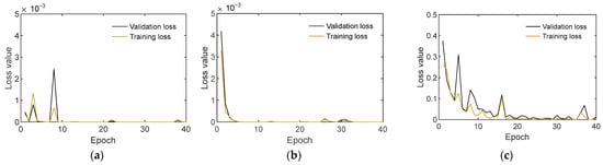 Loss values of the 1-D CNN model using partially untrained SVD databanks: (a) Case 1; (b) Case 2; (c) Case 3.