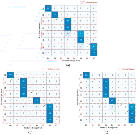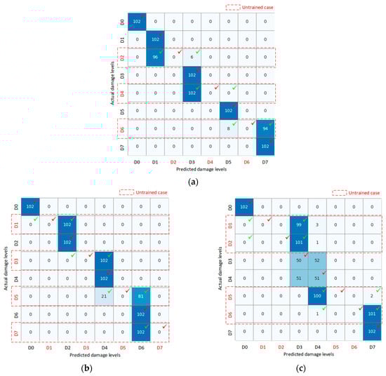 Figure 23a shows the damage classification results for the untrained Case 1. The data in all trained damage levels wasaccurate, with no misclassifications. The untrained damage levels were classified to nearby ones: D2 was classified to D3; D4 was classified to D3 and D5; D6 was classified to D5 and D7. Figure 23b shows the damage classification results for the untrained Case 2. There was no misclassification in the classification results for trained levels (i.e., D0, D2, D4, and D6). The untrained damage levels were classified into nearby ones: data from D1 and D3 were classified as D2; and data from D5 and D7 were classified as D6. Figure 23c shows the untrained Case 3. The distance between trained damage levels increased to two levels when D1, D2, D5, and D6 were neglected. The CNN model maintained its ability to make correct classifications for trained damage levels. The untrained damage levels D1 and D2 were classified as the nearest damage level D3, while untrained damage levels D5 and D6 were classified as the nearest damage level D7.