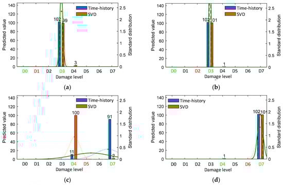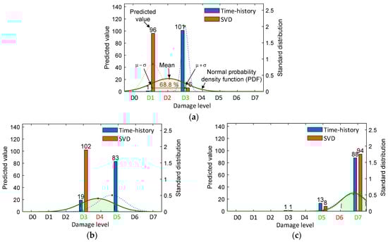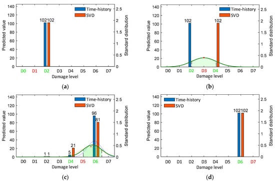 For the untrained damage D4 in Case 1 (Figure 26b), the blue-shaded region indicated damage levels D4–D5 based on the time-history data, where the mean value leans towards D5. All classification results based on SVD data indicated damage level D3, hence their normal PDF chart is not shown. The combined results in the green-shaded region indicate that the damage level was classified to D4.