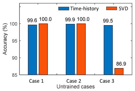 Figure 29 compares the accuracy of CNN models trained using time-history and SVD data under three untrained cases. All CNN models achieved high accuracy. For Case 1 and Case 2, the CNN models trained using time-history responses achieved accuracies of 99.6% and 99.9%, respectively. Meanwhile, the CNN models trained using SVD responses had an accuracy of 100% for both cases. For Case 3, the CNN model trained using time-history data maintained high accuracy at 99.5%. However, the accuracy of the CNN model trained using SVD data fell to 86.9%. Note that the misclassification mainly came from the trained damage levels (i.e., D3 and D4). This comparison reveals that each approach adapted to particular situations. Therefore, using both approaches and integrating their results could provide better insights and enhance overall classification accuracy.