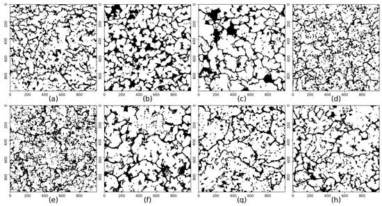 Digital image analysis of the preprocessed images was performed to calculate the absolute porosity, tortuosity, and average throat size. A segmentation method was applied to separate the pores from the solid matrix in the digital image to calculate the absolute porosity () [26,27]. The image was converted into binary format so that the pixels representing the pores (usually black pixels) and the solid matrix (white pixels) could be separated. This thresholding process can be performed manually or automatically using the Otsu algorithm to determine the optimal threshold value [28]. Once the binary image is obtained, the absolute porosity is calculated as the ratio of the number of pixels representing pores () to the total pixels in the image ():
