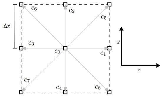 The LBM is a numerical method that uses a mesoscopic approach to describe fluid dynamics with complex boundary conditions such as geometry in porous media. It has been used extensively to characterize the transport mechanism in porous media, and has several advantages including having a simple, efficient algorithm in parallel systems suitable for overcoming complex geometries and boundary conditions [18]. In addition, it is a powerful technique for computational modeling of a wide variety of complex fluid flow problems, including single-phase [19,20] and multi-phase flows in complex geometries [21]. This method naturally accommodates various boundary conditions and can simulate solute transport and solve advection–dispersion equations [22]. Figure 3 shows the schematic of the 2-D Lattice Boltzmann method.
