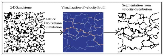 Permeability is an essential petrophysical parameter to determine the flow characteristics of hydrocarbons [6] and can be calculated by fluid flow simulation, nuclear magnetic resonance, core analysis, and digital rock physics [7,8,9]. However, laboratory measurements are difficult to perform for fluid flows that are not gas because some clays attach to the porous media, causing the fluid to be contaminated and mixed [10]. Computational Fluid Dynamics (CFD) serves as an alternative method for determining effective parameter values in rocks through fluid flow simulation. This approach offers advantages such as the elimination of fluid contamination and reduced measurement time [8]. In this study, the fluid flow simulation is conducted using the Lattice Boltzmann method (LBM) for single-phase flow [11]. The LBM is a numerical technique that employs a mesoscopic approach to model fluid dynamics, particularly effective in handling complex boundary conditions like those found in porous media. Previous research has utilized the LBM for various applications, including investigating the flow of non-Newtonian fluids in fracture networks [12], simulating gas flow, and predicting permeability in porous media by comparing single relaxation time (SRT) and multiple relaxation time (MRT) schemes [13], and modeling heat transfer processes [14,15]. These studies have demonstrated the validity of the LBM in simulating fluid flow in complex geometries. The present study focuses on simulating single-phase flow in 2-D porous rock media using the LBM to obtain velocity and pressure profiles, which are then used to calculate effective fluid parameters. The permeability of the rock was determined through Darcy’s law, comparing fluid flow simulation results with digital image analysis [8]. The rock sample used in this study was sandstone, which had undergone prior pre-processing [16]. The physical parameters were calculated using the OpenLB software to simulate fluid flow [17].