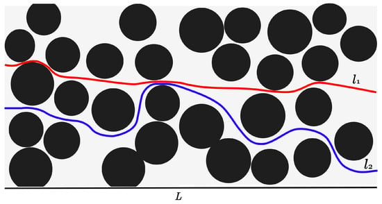 Illustrated fluid flow in porous media. The red line () represent the shortest path, while the blue line () represent the longest path.