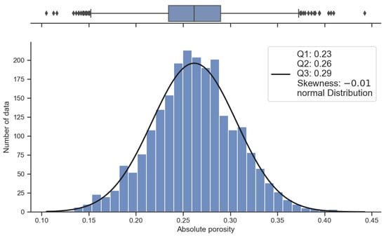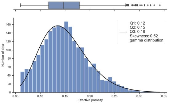 The absolute porosity distribution was normal with negative skewness, and thus relatively symmetrical, whereas the effective porosity distribution exhibited a gamma distribution, indicating that the data tend to cluster in the lower distribution range and are positively skewed. Therefore, the effective porosity values are smaller than the absolute porosity.