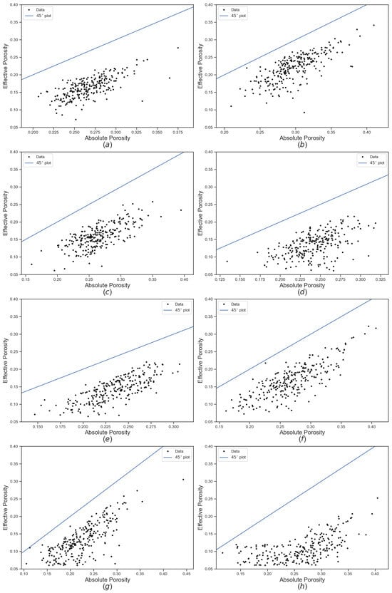 The effective porosity quartiles of , , and were smaller compared with the quartile values for absolute porosity. The absolute porosity (y-axis) was plotted against the effective porosity (x-axis) in a scatter plot in Figure 8, showing that the relationship between these two porosities is directly proportional with a positive gradient, indicating that higher absolute porosity generally corresponds to higher effective porosity. However, the data points are below the blue line that represents the line, the equilibrium line where absolute porosity equals effective porosity; therefore, the effective porosity in this case, is always smaller than the absolute porosity.