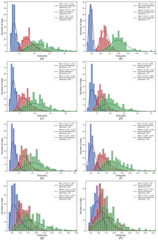 Distribution of tortuosity: (a) Bandera gray rock, (b) Bentheimer rock, (c) Berea rock, (d) Berea sister gray rock, (e) Berea upper gray rock, (f) Buff Berea rock, (g) Leopard rock, (h) Castlegate rock.