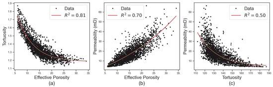 The plots in Figure 10 illustrate the relationships between effective porosity, permeability, and tortuosity. In Figure 10a, a strong inverse correlation () is observed between effective porosity and tortuosity, indicating that, as effective porosity increases, the pathways for fluid flow become less complex, reducing tortuosity. Figure 10b shows a positive correlation () between effective porosity and permeability, suggesting that higher effective porosity results in better fluid transmission through the rock. In Figure 10c, a moderate inverse correlation () is found between tortuosity and permeability, implying that more convoluted pathways (higher tortuosity) hinder fluid flow, resulting in lower permeability. Overall, these plots highlight the interrelated nature of these parameters, where higher effective porosity generally leads to lower tortuosity and higher permeability, facilitating easier fluid movement through the rock.