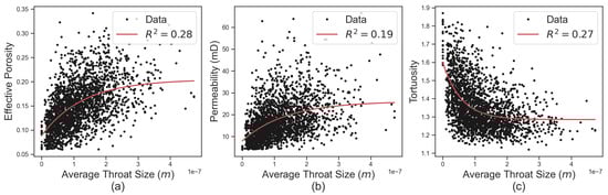 Correlation of fluid parameters: (a) correlation of effective porosity vs. average throat size, (b) correlation of permeability vs. average throat size, (c) correlation of tortuosity vs. average throat size.