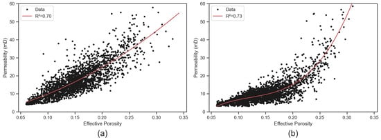 The permeability values were also calculated using the Kozeny–Carman Equation and compared with the permeability values obtained from simulations using Darcy’s Equation. Figure 12 is a plot of permeability versus effective porosity. In Figure 12a, the correlation between permeability and the effective porosity is positive, with the coefficient of determination () indicating that of the variation in permeability can be explained by the variation in effective porosity. This demonstrates a relatively strong relationship between the two variables. The data points are scattered with some deviations but generally follow the overall trend according to the applied equation. In Figure 12b, the relationship between permeability and the effective porosity shows a similarly strong positive relationship, with . The Darcy and the Kozeny–Carman models have a similar range of permeability data but the Kozeny–Carman model permeability values tend to be lower compared with the values obtained using the Darcy model.