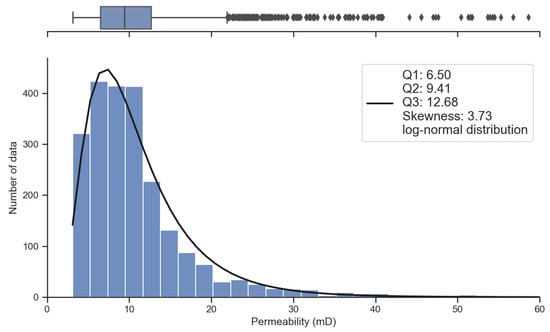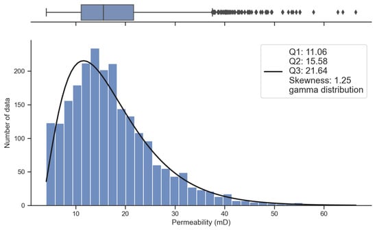 The distribution of the permeability model using the Kozeny–Carman Equation exhibits a log-normal form with a positive skewness value (right-skewed), whereas the distribution of the permeability data using the LBM is closer to a gamma distribution with positive skewness but is lower compared with the skewness value in the permeability distribution of the LBM.