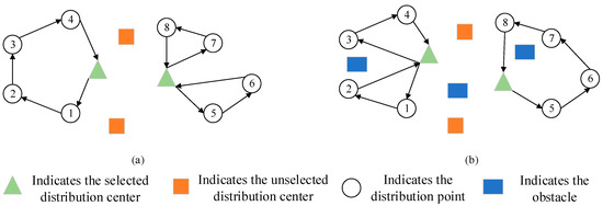 In the context of the BE-LRP, it is essential to address the influence of obstacles on the distribution distance during the initial phase. Subsequently, in the realm of task planning, it is imperative to identify a set of delivery destinations, which are contingent upon the distribution center’s location, capacity limitations, time constraints, and other pertinent factors.